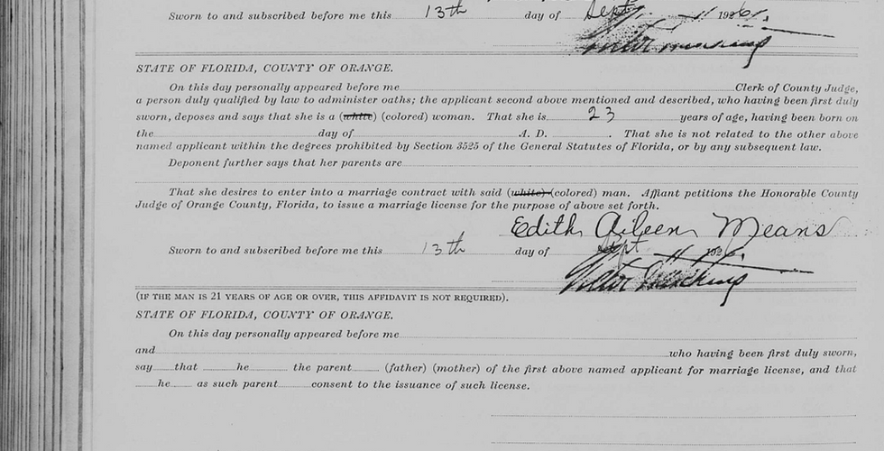 On the record, it shows that on July 23rd, 1943, Edith Aileen Means married a man by the name of Robert E. Davis, who originally hailed from Illinois. However, Aileen lists the year she was divorced from Michael Gladden Jr. as 1939- four years after Marie Stapler married Mr. Gladden. Given that the two marriages occurred in Orange and Volusia counties, respectively, it is reasonable to infer that Mr. Gladden and Marie Stapler were married in another county because they would not have a preexisting marriage record. This Saturday, I hope to figure out the year when Aileen left Mr. Gladden to further understand the fascinating life events of the Gladden family. I’ll let you know what I find out next week, reader!